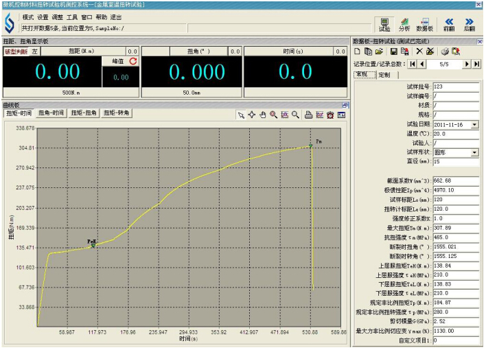 2.1主機:采用臥式結構,主體結構采用臥式框架結構,以保證整機的剛性。夾具采用優(yōu)質合金結構鋼淬火(HRC45~50)方式,主傳動軸采用合金結構鋼淬火處理,保證其使用壽命。試樣的安裝、拆卸方便、快捷。夾頭的活動端采用精密重型導軌,使其能自由移動,將試件的軸向拉力減少到最小。 試件徑向載荷的加載,采用全數(shù)字交流伺服電機驅動,精密行星齒輪減速機傳動方式,使其實現(xiàn)閉環(huán)控制。加載能力最大10kN。 2.2驅動系統(tǒng):由日本進口全數(shù)字交流伺服控制系統(tǒng)驅動。速度調節(jié)范圍寬,加載均勻、穩(wěn)定。 2.3傳動系統(tǒng):采用行星擺線針輪減速器傳動,保證傳動的均勻、穩(wěn)定及傳動精度。橫向空間0~600mm范圍內任意手動調節(jié)。徑向載荷的加載位置,可以在試件的長度范圍內隨意調整。 2.4測量顯示系統(tǒng):該機采用光電編碼器采集試樣的扭轉角度,高精度扭矩傳感器采集試樣的扭矩,高精度扭轉計測量試樣的扭轉變形。計算機屏幕顯示試樣的扭矩、扭轉角度、扭轉變形以及各類曲線等。也可以顯示扭矩—徑向載荷曲線。 2.5軟件操作: ①控制模式采用智能專家設置系統(tǒng),用戶可以根據(jù)自己的實際要求編制試驗過程控制方式,自動完成試驗。 ② WinXP全中文界面,人機對話方式。試驗的全部操作均借助鍵盤及鼠標操作,通過計算機鍵盤與鼠標完成,計算機屏幕顯示試驗扭矩T,扭轉角度θ,各種試驗曲線(扭矩—徑向載荷、扭矩-時間曲線、扭矩-角度曲線、角度-時間曲線等)試驗機工作狀態(tài)等。 ③曲線坐標的大小可以根據(jù)實際的試驗數(shù)據(jù)進行調整。 ④輸出打印各種試驗報表格式(報表格式可以Excel或Word格式輸出)。 ⑤符合JB/T9370—1999《扭轉試驗機技術條件》及GB/T10128—2007《金屬室溫扭轉試驗方法》數(shù)據(jù)處理的相關要求。 ⑥可以檢測試件的屈服點τs、上屈服點τsu、下屈服點τsl、抗扭強度τb等。扭矩和扭轉角自動跟蹤測量,并顯示試驗曲線。顯示試驗的扭矩值、扭轉角、扭轉速度。 試驗結束后,自動進行試驗數(shù)據(jù)處理,能自動求取材料的切變模量G、規(guī)定非比例扭轉應力τp、屈服點、上屈服點τsu、下屈服點τsl、抗扭強度τb等性能參數(shù)。能根據(jù)用戶要求可隨意編制報告格式并可輸出打印試驗報告。 ★試驗過程可以實現(xiàn)模擬再現(xiàn)。 ★試驗機可以實現(xiàn)連續(xù)加載和任何負荷下保持載荷兩種功能。試驗過程中無沖擊和震動,具有良好的讀數(shù)穩(wěn)定性。 ★可以任意多條試驗曲線疊加對比、輸出打印。 ★可以進行數(shù)字化調零和標定。 ★試驗數(shù)據(jù)采用數(shù)據(jù)庫管理方式,便于查詢和維護。 ★軟件系統(tǒng)的操作可以實現(xiàn)三級用戶管理,安全、方便、快捷。 試驗操作界面如下: